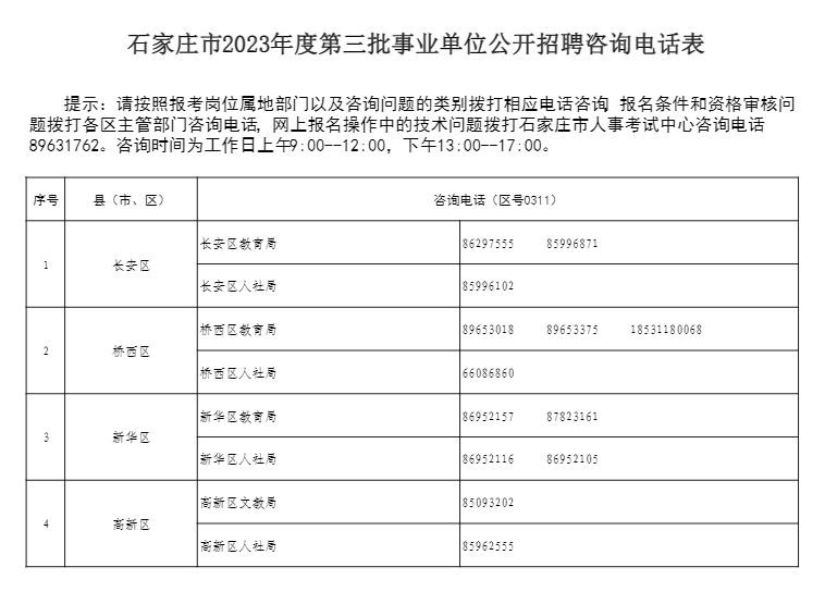 附件2:石家庄市2023年度第三批事业单位公开招聘咨询电话表