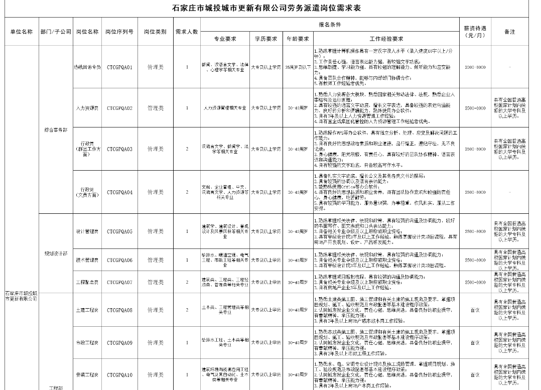 根据工作需要,石家庄市城投城市更新有限公司特委托石家庄市国经人力资源管理有限公司面向社会公开招聘劳务派遣制人员21名。现将具体招聘流程设定如下: