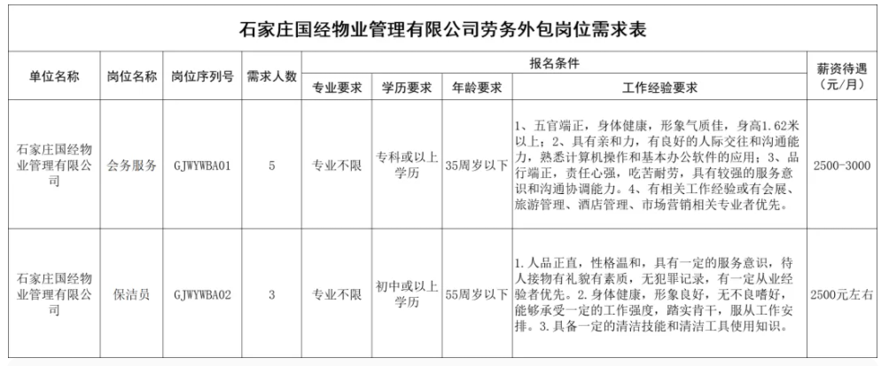专业不限!初中学历有岗!石家庄国经物业管理有限公司招聘公告