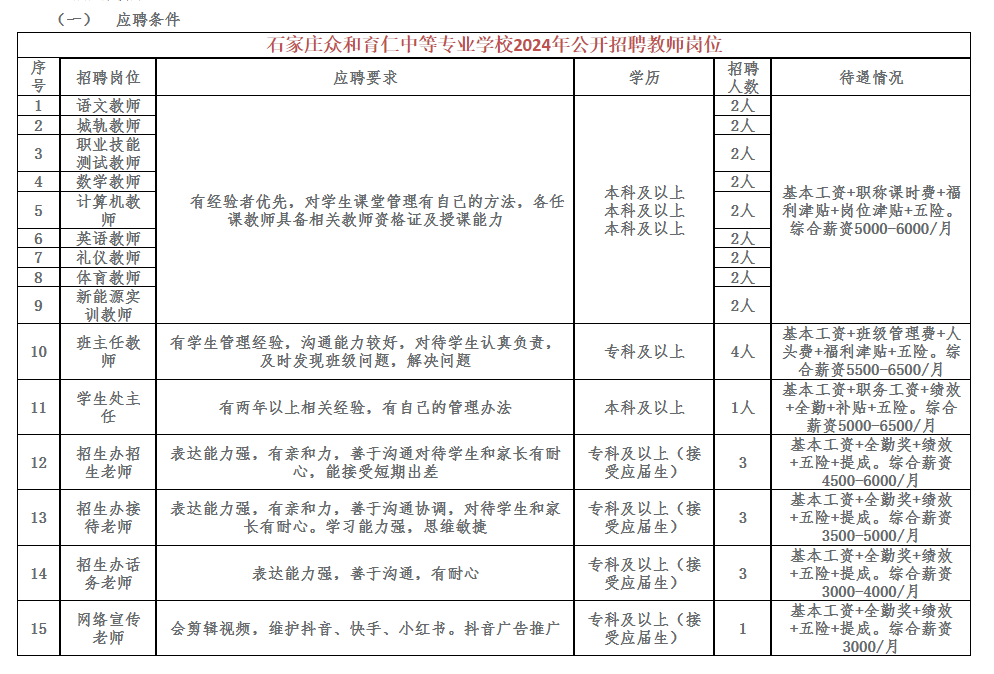 石家庄众和育仁中等专业学校2024年公开招聘教师公告