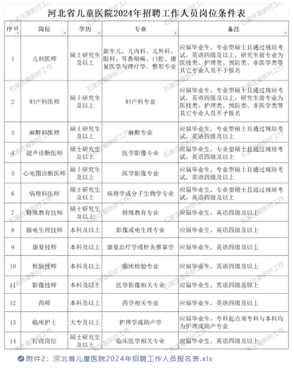 详见河北省儿童医院2024年公开招聘工作人员岗位条件表(附件1)