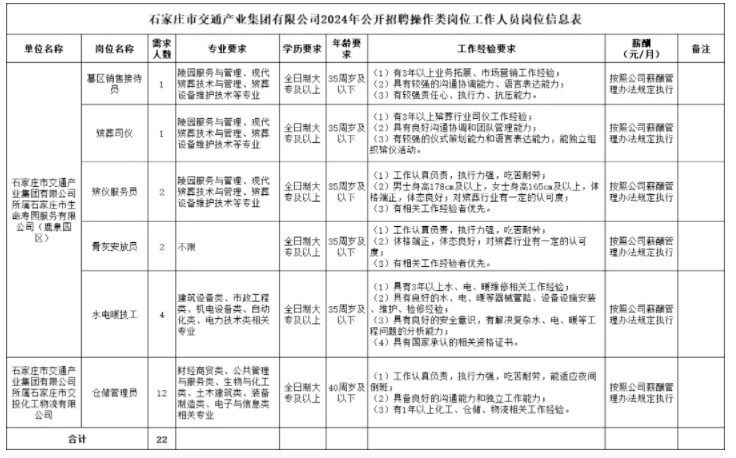 石家庄市交通产业集团有限公司2024年公开招聘22名操作类岗位工作人员公告