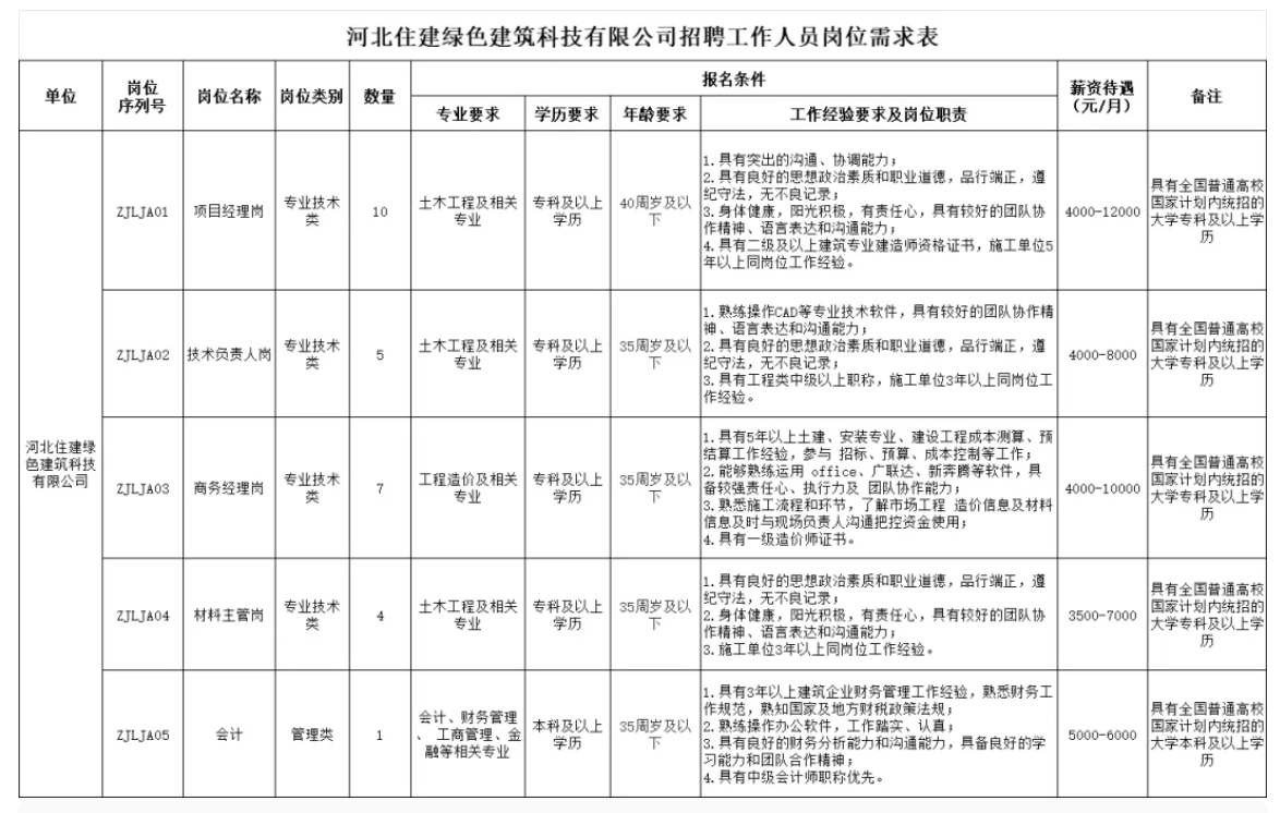 河北住建绿色建筑科技有限公司招聘27名工作人员公告