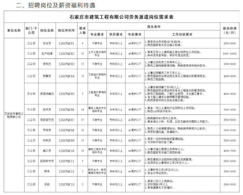 石家庄市建筑工程有限公司劳务派遣制人员招聘127人公告
