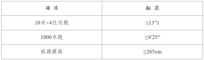 6.成绩确认:报考者先进行身高测量,再依次参加纵跳摸高、10米×4往返跑、1000米(男)/800米(女)跑,成绩现场公布。身高测量和体能测评采取单项淘汰制,全部达标为合格,进入笔试环节;身高测量或体能测评中的任何1个单项不达标,即为不合格,单项不合格的报考者立即离场,不再参加其他项目。