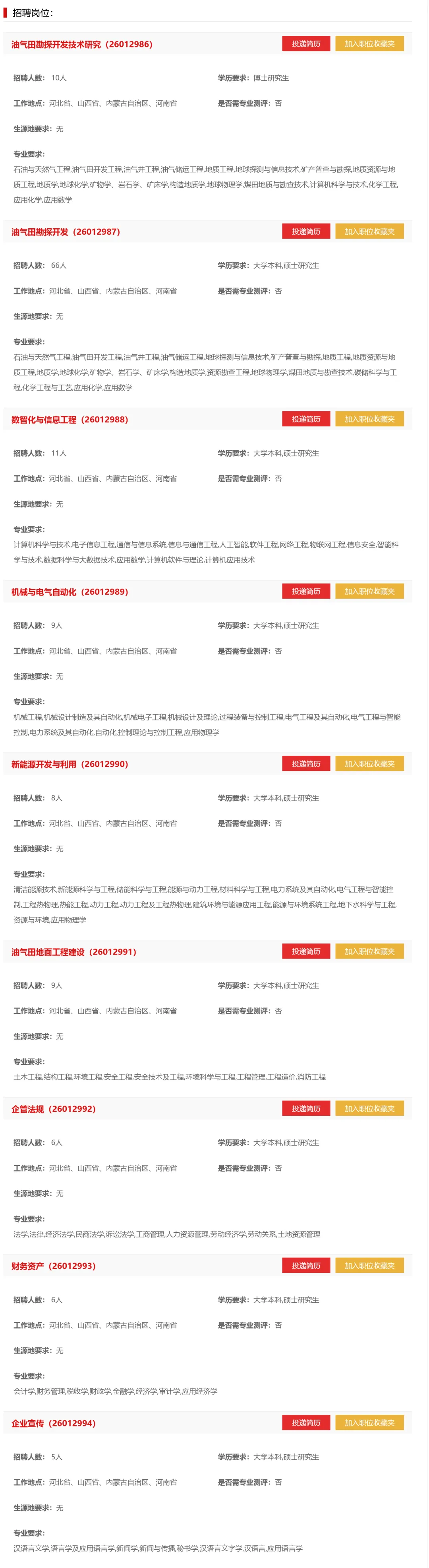 本次高校毕业生招聘主要面向2026届高校毕业生,以及符合报名条件并取得国家教育部留学服务中心学历学位认证的留学回国人员;未落实工作单位,档案、组织关系仍保留在原毕业院校的2025届毕业生也可报名。 截至2026年8月31日,本科毕业生年龄不超过26岁、硕士研究生年龄不超过30岁、博士研究生年龄不超过35岁。 国内应届本科毕业生的大学英语四级考试成绩不低于425分,研究生的大学英语六级考试成绩不低于425分;本科生和研究生第一外语为英语以外语种的,其外语水平应分别达到相应标准;外语专业毕业生应具有专业最高等级水平。 留学生按照报名的外语种类,根据招聘单位工作需要,参加中国石油考试中心外语水平考试,其中英语水平考试不低于500分,俄语、法语、西语、日语不低于80分。 国内毕业生和留学生也可提供个人两年内取得的官方外语考试成绩证明,英语成绩新托福不低于70分、雅思不低于6.0分、领思不低于160分、托业不低于785分,小语种需提供相应证明。 符合招聘岗位报名要求,达到下列条件之一的,免予参加通用能力考试。 1.2025年泰晤士高等教育世界大学排名前50名高校的研究生或泰晤士高等教育世界大学排名中国内地排名前10名高校的毕业生; 2.国内高校所在学科达到教育部学科评估结果为A+的毕业生; 3.获得过全国油气地质大赛、工程设计大赛、化工设计竞赛、勘探地球物理(软件开发)大赛一等奖及以上的硕士研究生; 4.获得过王涛英才奖学金的毕业生或两次获得过国家奖学金的硕士研究生; 5.两次评选为普通高校省级“三好学生”“优秀学生干部”的硕士研究生; 优才范围中,泰晤士世界排名前30名和国内排名前10名高校、学科评估结果为A+的国内高校硕士研究生及以上学历毕业生,纳入高层次毕业生范围。 毕业生通过中国石油高校毕业生招聘平台(https://zhaopin.cnpc.com.cn)进行应聘报名。中国石油高校毕业生招聘平台是华北油田公司唯一招聘通道。 按照应聘基本条件以及招聘岗位具体条件对应聘毕业生进行资格审查,确定参加通用能力考试名单。 资格审查通过的毕业生参加集团公司委托第三方考试机构统一组织的通用能力考试,具体考试信息以中国石油高校毕业生招聘平台发布的考试公告为准。 在中国石油高校毕业生招聘平台统一发布入围名单,公示期为5天。 组织对入围毕业生进行面试考核,根据需要开展人才测评、背景调查等。 根据面试及测评结果,综合研究确定拟录用及递补人员名单。 与拟录用毕业生签订《就业协议书》和《信息真实性承诺书》。在中国石油高校毕业生招聘平台上对拟录用及递补人员名单进行公示。 2026年8月31日前,完成毕业生报到、资格复核、入职注册和入职集中培训等工作。 (一)政治立场坚定,品行端正,遵纪守法,热爱石油事业,认同中国石油企业文化和价值观。 (二)忠诚石油事业,品学兼优,诚实守信,无不良记录。 (三)身心健康,吃苦耐劳,服从分配,能胜任所分配岗位的工作。 (四)所学专业符合招聘岗位要求,满足公司业务发展需要。 (五)学习成绩优良,2026年8月31日前取得符合公司入职要求的学历学位证书等。 (一)个人信息栏:请按要求上传个人近期免冠证件标准照,准确如实填写全部报名信息,如无该项信息,可填“无”,不得留空。 (二)教育背景及其他描述:准确填写个人专业排名、综测排名、学分绩点(研究生还需填写全部所学课程的平均分数)。 (三)获奖情况描述:请填写获得的校级及以上荣誉,请注明荣誉内容及颁发单位名称。属于免考范围的毕业生须上传相应的荣誉奖项证书、证明材料。 (四)应聘人员须一次性上传个人在校成绩单(学校教务部门盖章)、英语四六级证书等所有审查材料扫描件。 (五)资格审查实行诚信承诺制度,毕业生应对个人信息和应聘资料真实性、准确性、完整性和有效性负责,一经填报即产生承诺效力。 (六)应聘人员应确保所提供的联系方式有效、畅通,以便我单位联络。面试、入职等招聘环节有关信息将通过电子邮箱形式通知,请及时关注。 (七)应聘人员有下列行为之一的,一经查实,取消应聘及录用资格;已经录用的,依法解除劳动关系。 1.伪造、涂改证件、证明,或以其他不正当手段获取录用资格的; 3.不守诚信,隐瞒相关事实,导致用人单位做出错误判断的; 咨询电话:0317-2760342;2760337 咨询时间:8:00-12:00,14:00-18:00(法定工作日) 电子邮箱:hbytzp@petrochina.com.cn