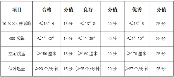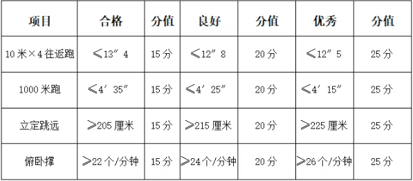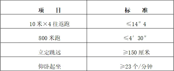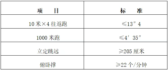 4.体能测评内容和标准:测评10米×4往返跑、立定跳远(可测2次)、俯卧撑(男)/仰卧起坐(女)、1000米(男)/800米(女)跑,共4个项目。合格标准如下: